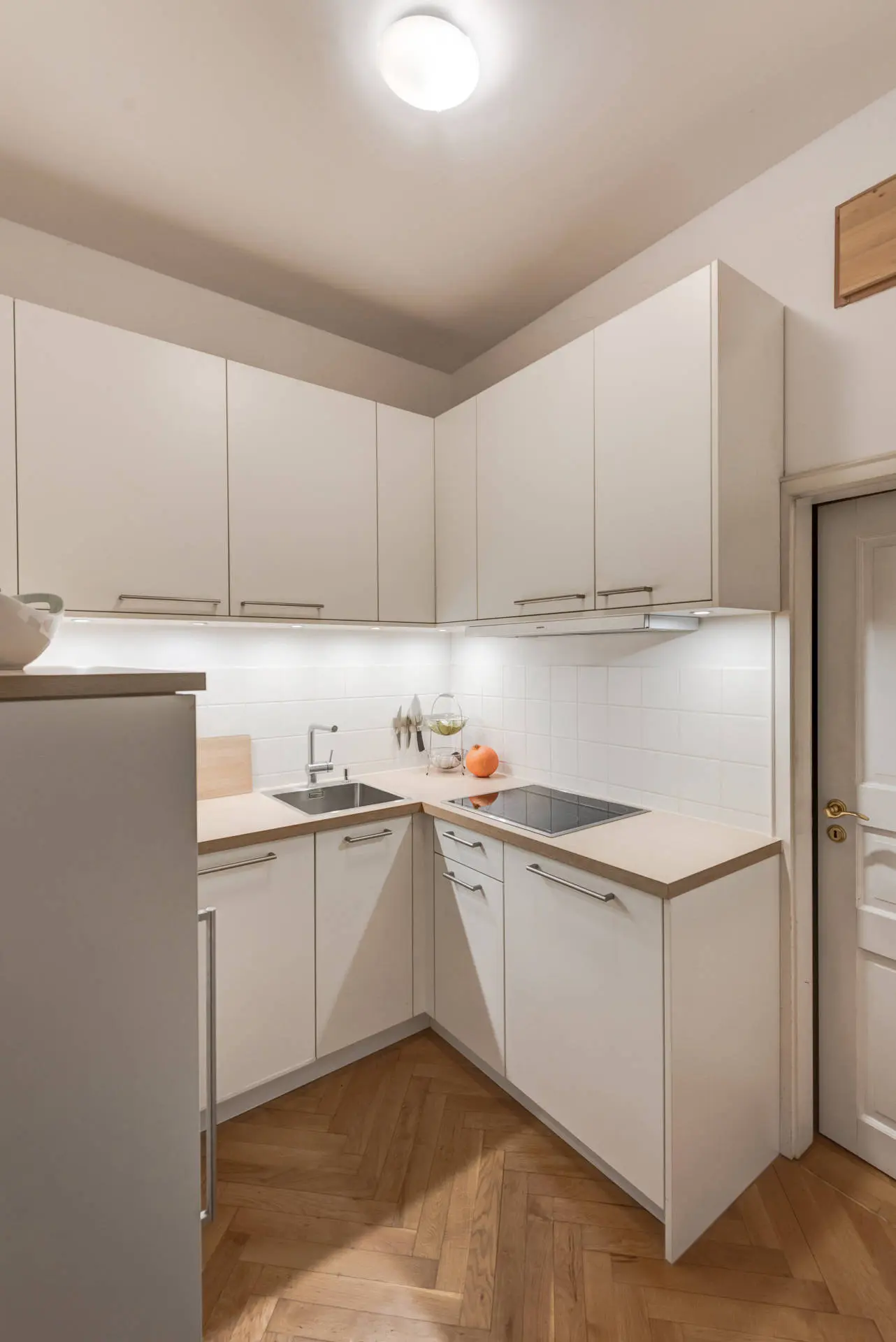 Um den Raum größer wirken zu lassen, verwendeten wir helle Oberflächen.