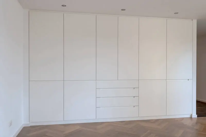 Über einen großen Torbogen erschließt sich das geräumige Wohnzimmer mit direktem Blick auf den Starnberger See. Hier bietet ein dezenter, geräumiger Einbauschrank mit vielen Fächern und Schubladen reichlich Stauraum.